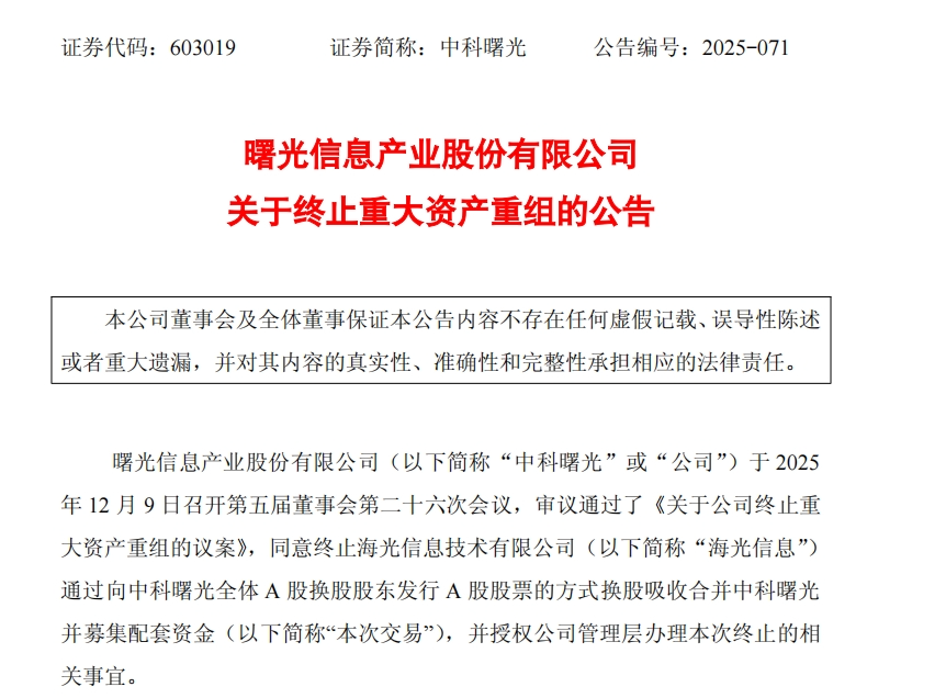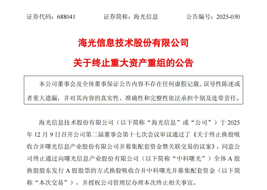 12月9日晚间,海光信息公告称,公司于2025年12月9日召开董事会,审议通过议案,同意公司终止通过向中科曙光全体A股换股股东发行A股股票的方式换股吸收合并中科曙光并募集配套资金,并授权公司管理层办理本次终止相关事宜。